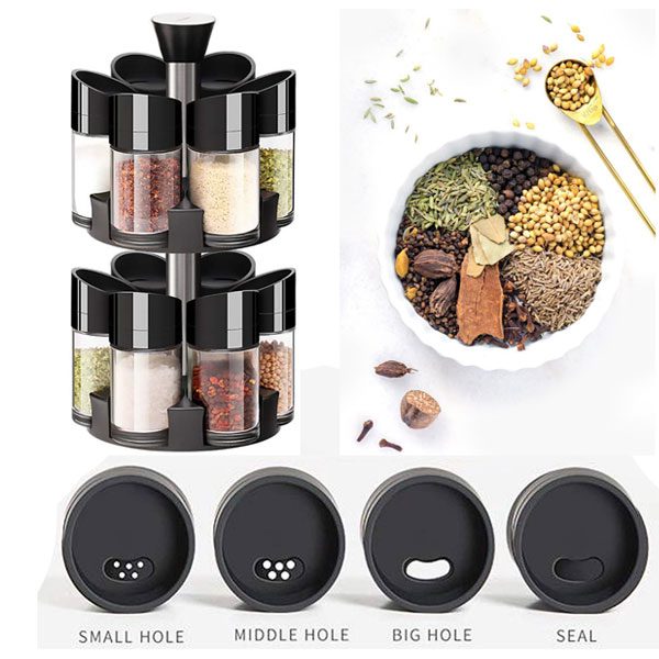 رف التوابل الدوار المكون من 12 قطعة مثالي لمطبخك ويمكن استخدامه لاحتواء مجموعة متنوعة من التوابل: الفلفل والسكر والملح والتوابل ومسحوق حساء الدجاج ونشا الذرة وما إلى ذلك.